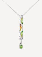 Подвеска на шею выполнена из высококачественного серебра 925 пробы с родированием. Вставки из природных необлагороженных демантоидов в градиенте цветов (1 крупный камень и 15 небольших). Ювелирное изделие идеально подойдет для торжественного мероприятия или вечерней прогулки. Украшение подчеркнет вашу индивидуальность и элегантность, изящно украсит шею и зону декольте, добавит образу неповторимое очарование.