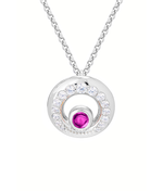 Подвес диаметром 15,3 мм с центральным элементом круглой формы из высококачественного серебра с родированием и вставками из выращенного малинового рубина огранки кабошон и фианитов.