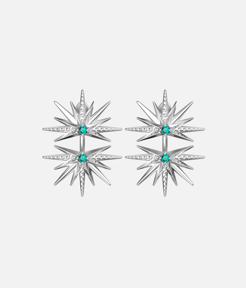 Серьги-джекеты «Две полузвезды» выполнены из высококачественного серебра 925 пробы с родированием и вставками из выращенного турмалина цвета параиба.