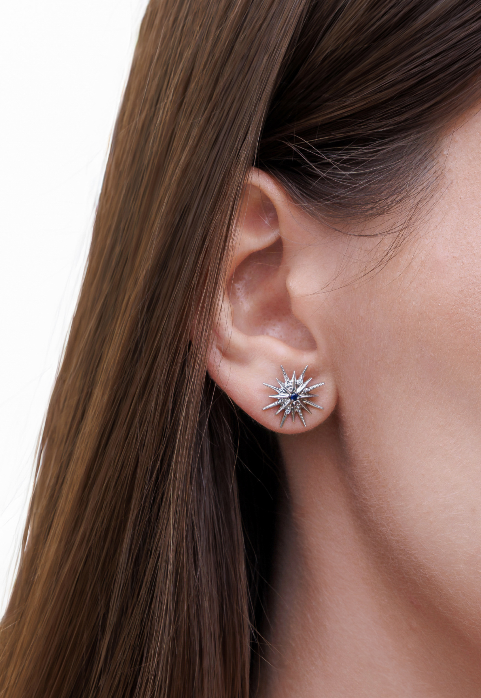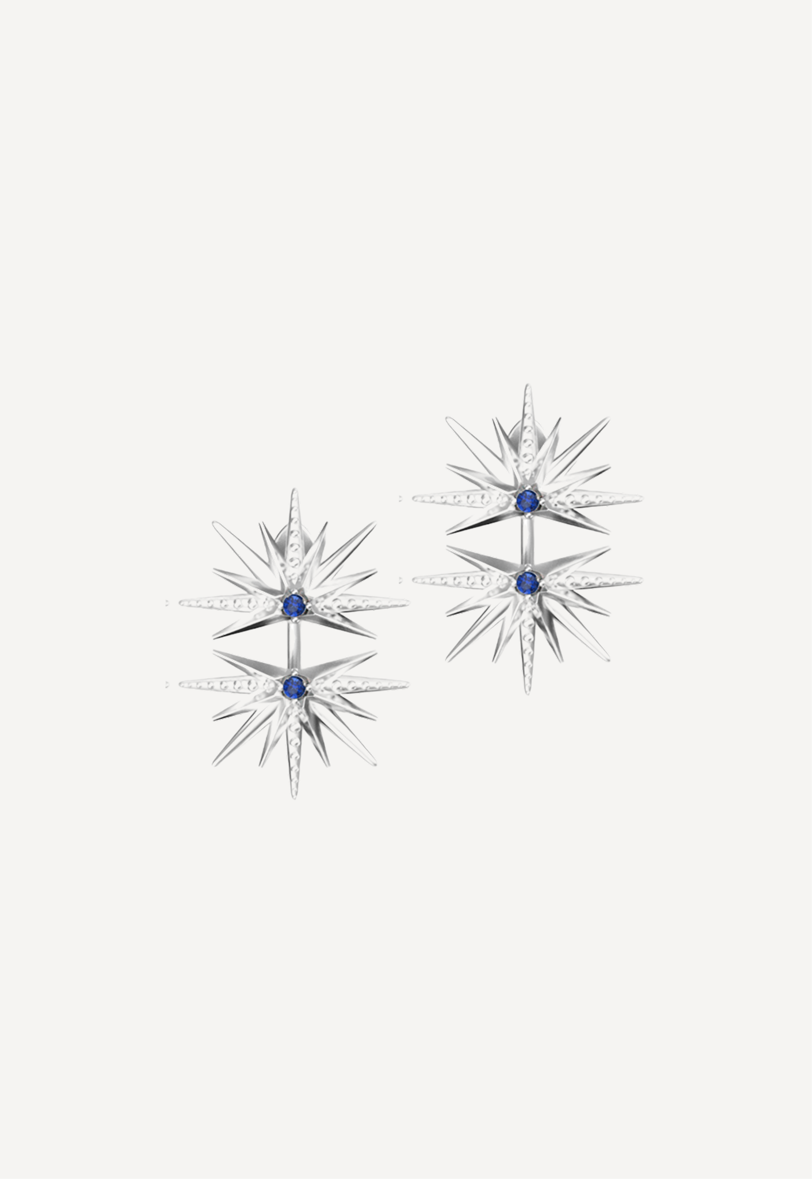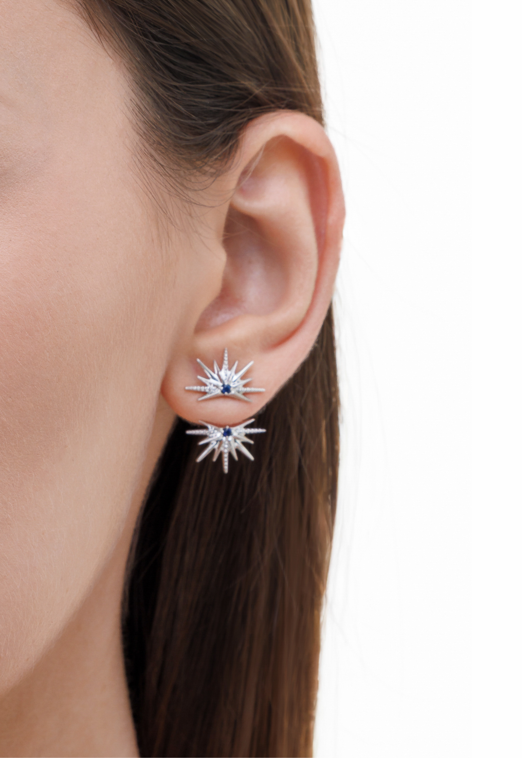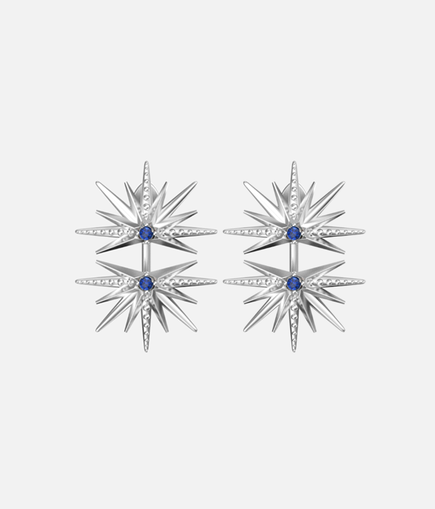 Серьги-джекеты «Две полузвезды» выполнены из высококачественного серебра 925 пробы с родированием и вставками из выращенного сапфира.